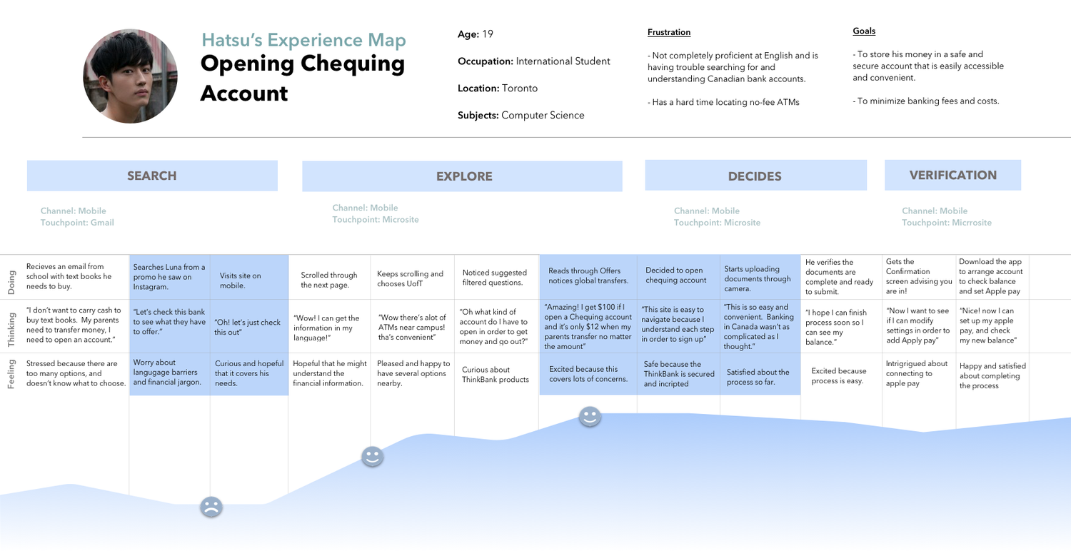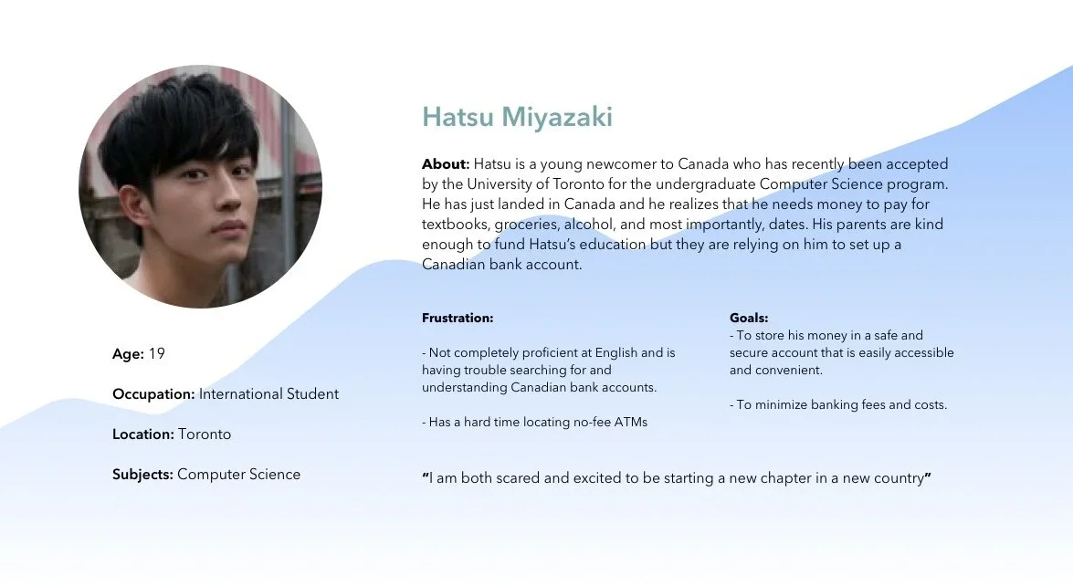 Keeping international students like Hatsu in mind, we based our design decisions around his motivations and needs to make Canadian banking easier.